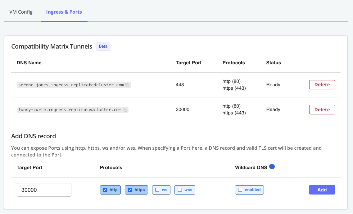 Under Ingress & Ports, for Add DNS record, click Add to create a DNS record using the default settings. This will provide a hostname where you can optionally access the Admin Console after you install.